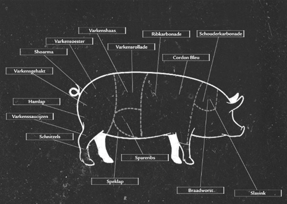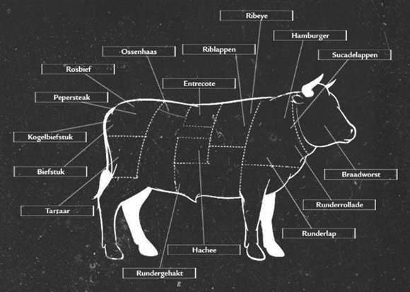 Ben jij ook benieuwd waar welk stukje vlees nu vandaan komt? Kijk dan op onderstaande afbeeldingen van een rund, varken, kip en kalf.